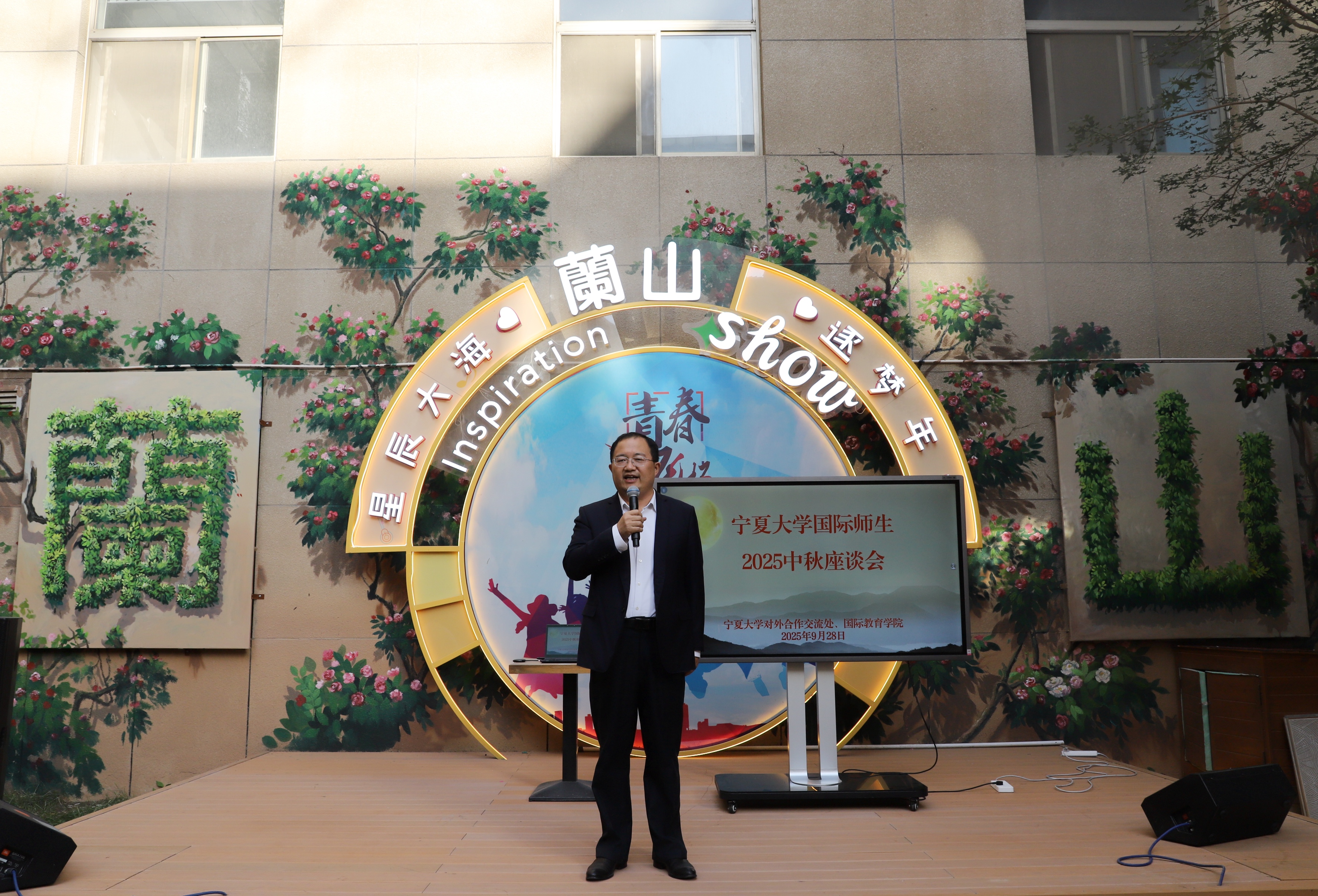 【宁夏大学新闻中心讯 对外合作交流处/文 王文娣/图】9月28日下午,在中秋佳节即将来临之际,由我校对外合作交流处、国际教育学院、守正书院联合主办的“月满华章 情融四海”国际师生中秋文化主题交流活动在贺兰山校区蘭山文化空间举行。校党委副书记、校长彭志科,校党委常委、副校长杨文法与来自19个国家的外籍教师及国际学生代表欢聚一堂,共话中秋、同叙情谊。