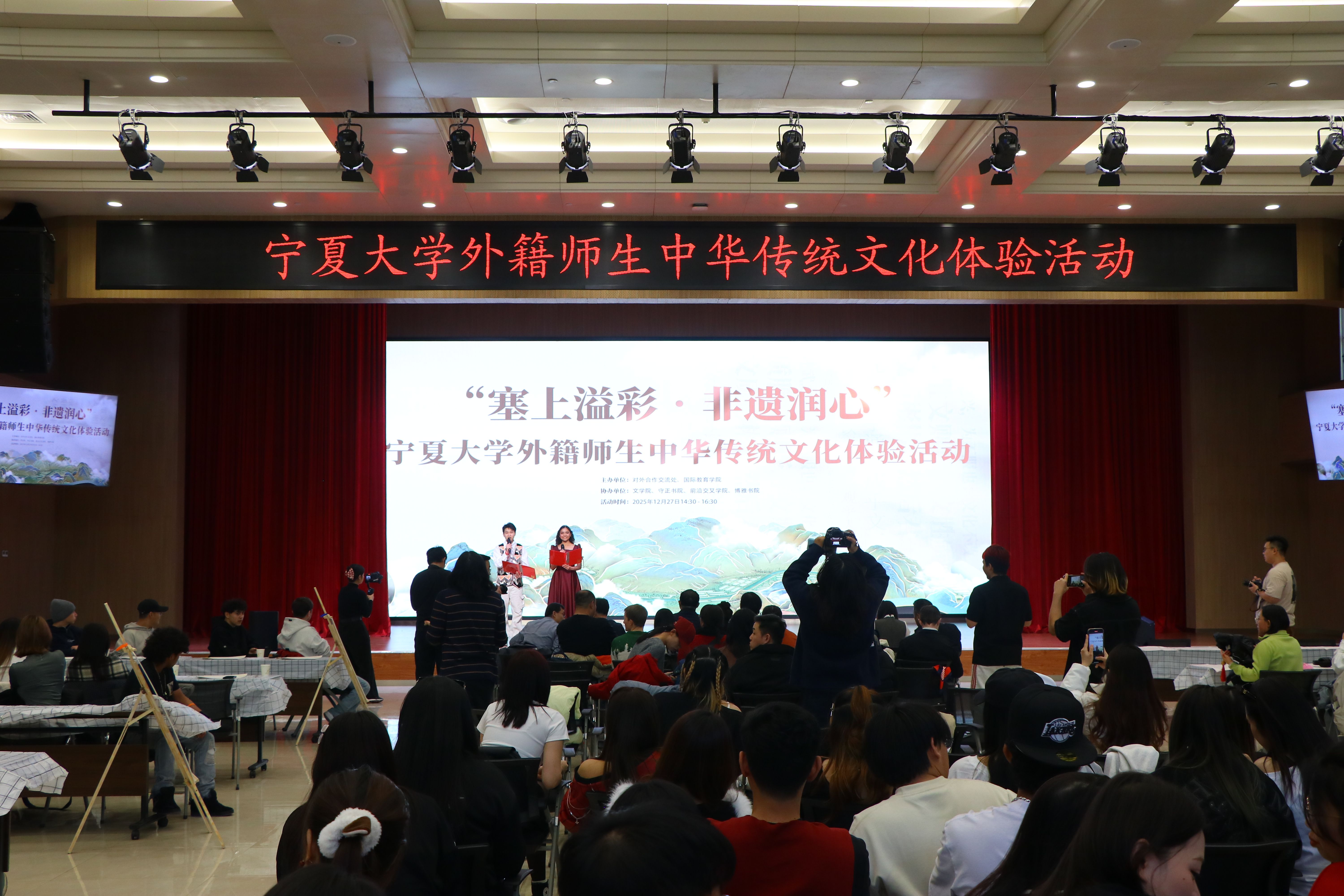 12月27日下午,“塞上溢彩 非遗润心”外籍师生中华传统文化体验活动在贺兰山校区笃行楼三楼报告厅举办,280多名外籍师生共同感受中华传统文化的魅力,开启了一场别开生面的文化感知与交流之旅。活动由对外合作交流处、国际教育学院主办,守正书院、博雅书院、前沿交叉学院协办,校党委副书记韩惠丽,校党委常委、副校长杨文法参加活动。